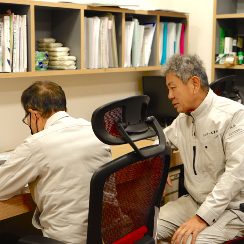 2010年入社 積算担当 1級土木施工管理技士 数字や計算に強く地道なコツコツした作業にも粘り強く取り組む忍耐力のある人。同僚から一言家族思いで、とても優しい坂口さんです!同僚のミスも、いつも優しく包み込んでくれています。普段はコツコツした作業が多いので、