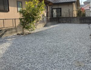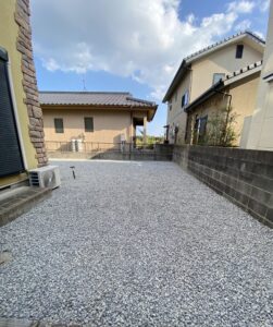 防草シートの上に化粧砂利を敷くことで、雑草の発生を抑えながら景観にも配慮した仕様です。